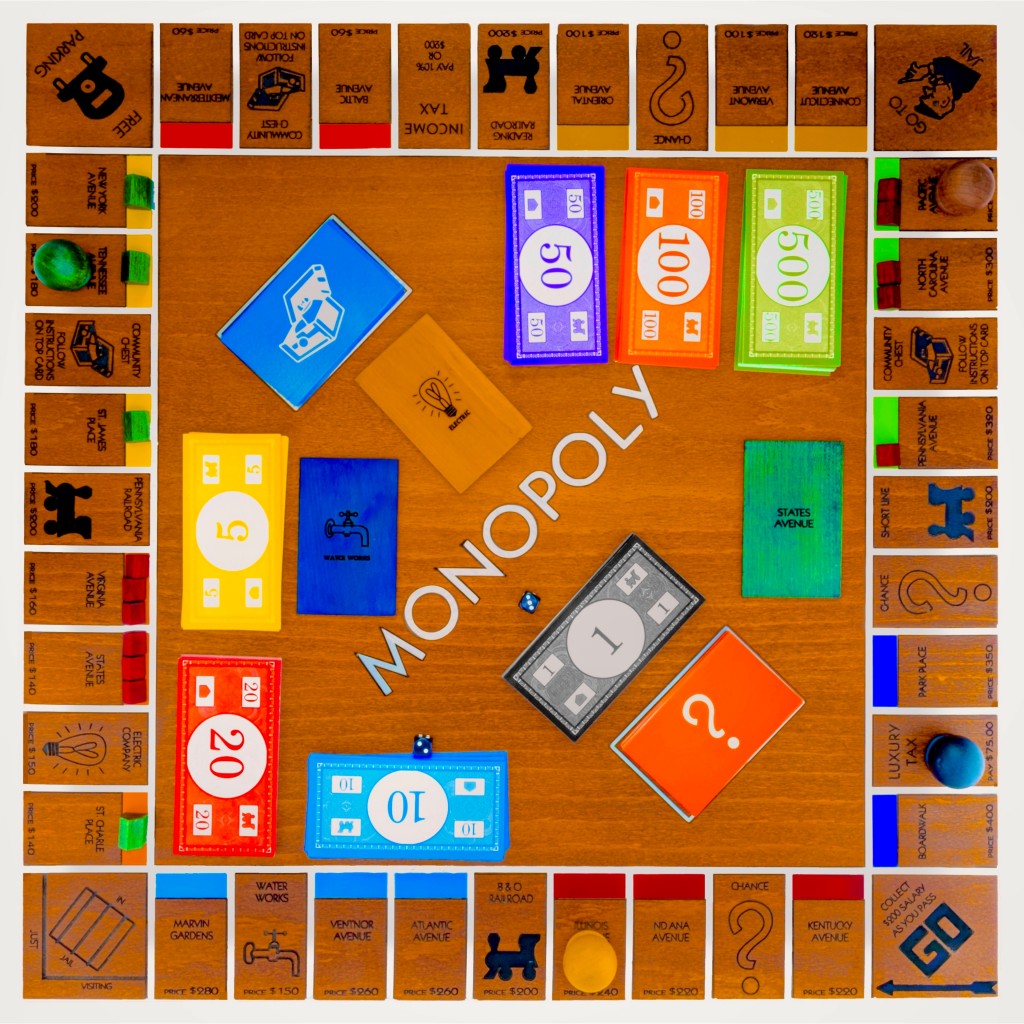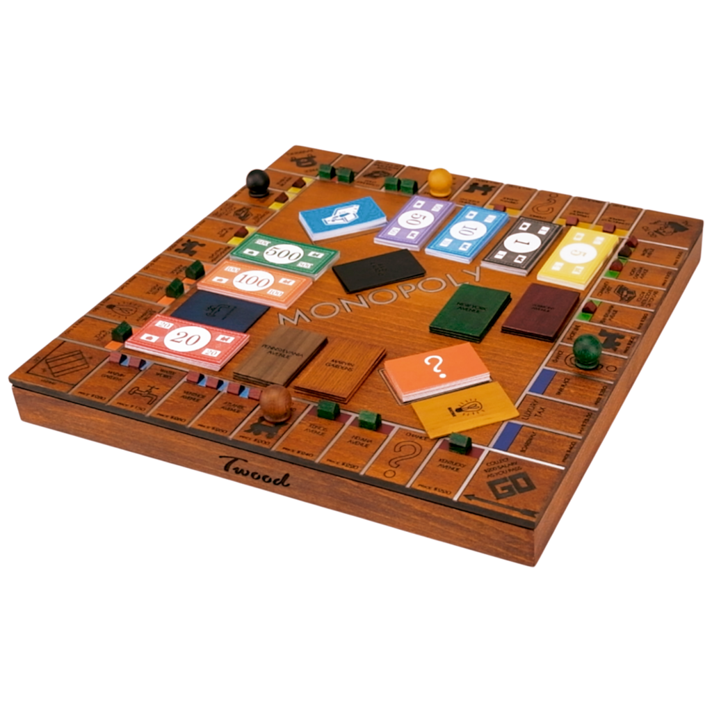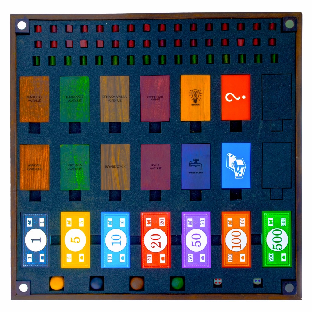 اسلایدها: صفحهی حکاکیشده، کارتها/اسکناسهای چوبی رنگی، ارگانایزر داخلی.